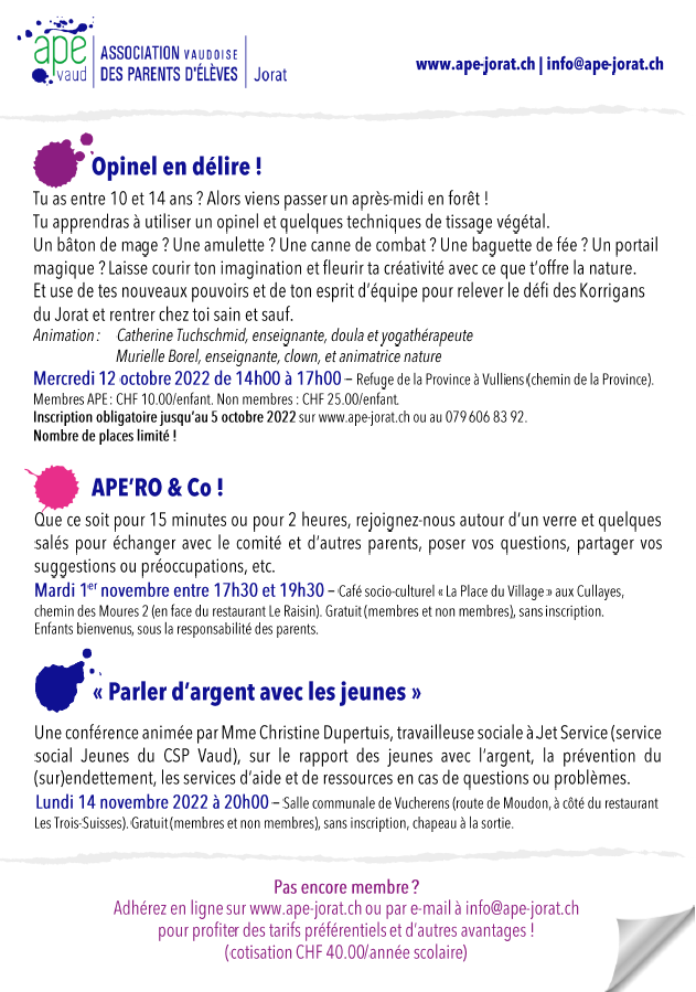 Attention, pour l’atelier « Opinel en délire! », le nombre de participants est limité, alors inscrivez-vous rapidement en cas d’intérêt. Priorité sera donnée aux membres APE.